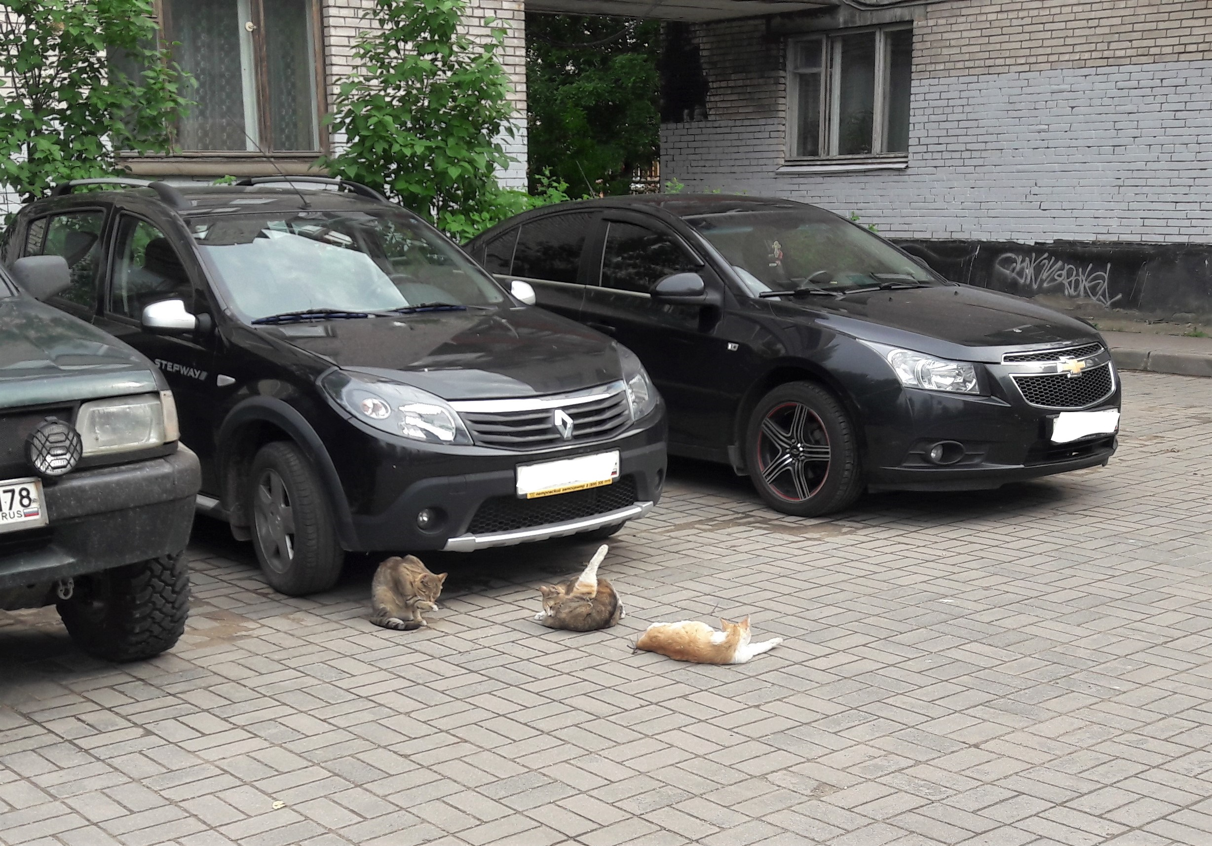 А ещё мы назвали Кингисепп городом кошек, потому что столько мурлыкающих, гуляющих самих-по-себе, моющихся, отдыхающих и мяукающих мы не видели давно. Вот, например, определённо банный день у этой троицы ;)