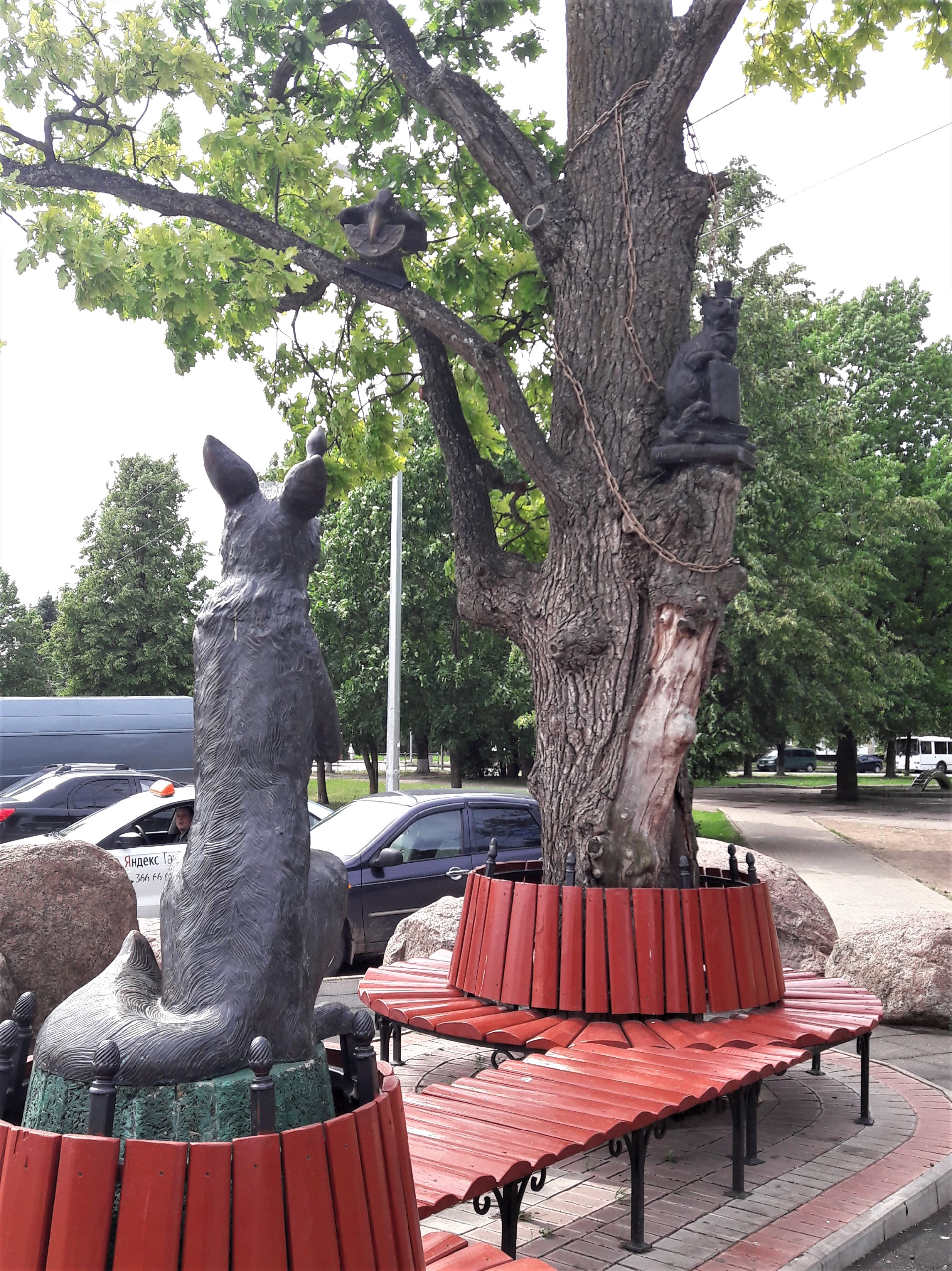 К более мирной тематике — Лиса и Ворона в городском пространстве, и здесь же кот учёный (правда, мне не понятно, зачем здесь кот…)